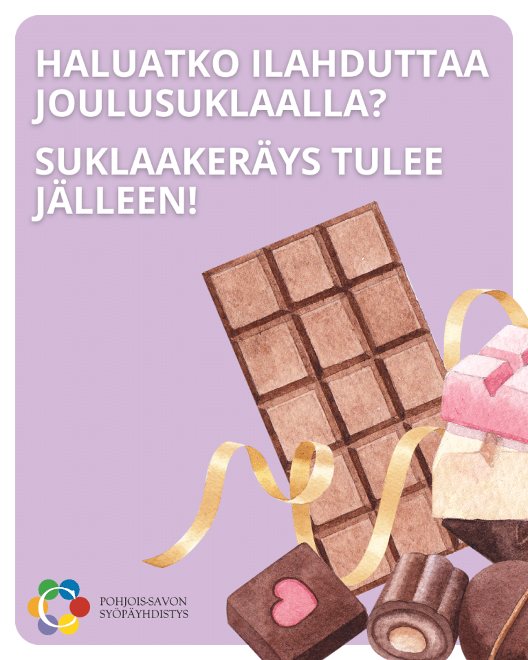 Lisätietoa suklaakeräyksestä: Minttu Aho, minttu.aho@pohjois-savonsyopayhdistys.fi, puh. 044 230 8741.